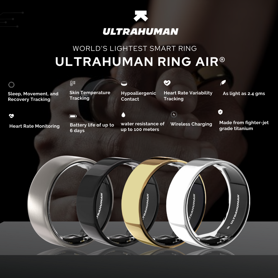 The Ultrahuman Ring is a sleek wearable that tracks sleep patterns, movement, heart rate, skin temperature, and recovery metrics. It is designed for comfort and continuous daily wear, so you can track your health without interruption.